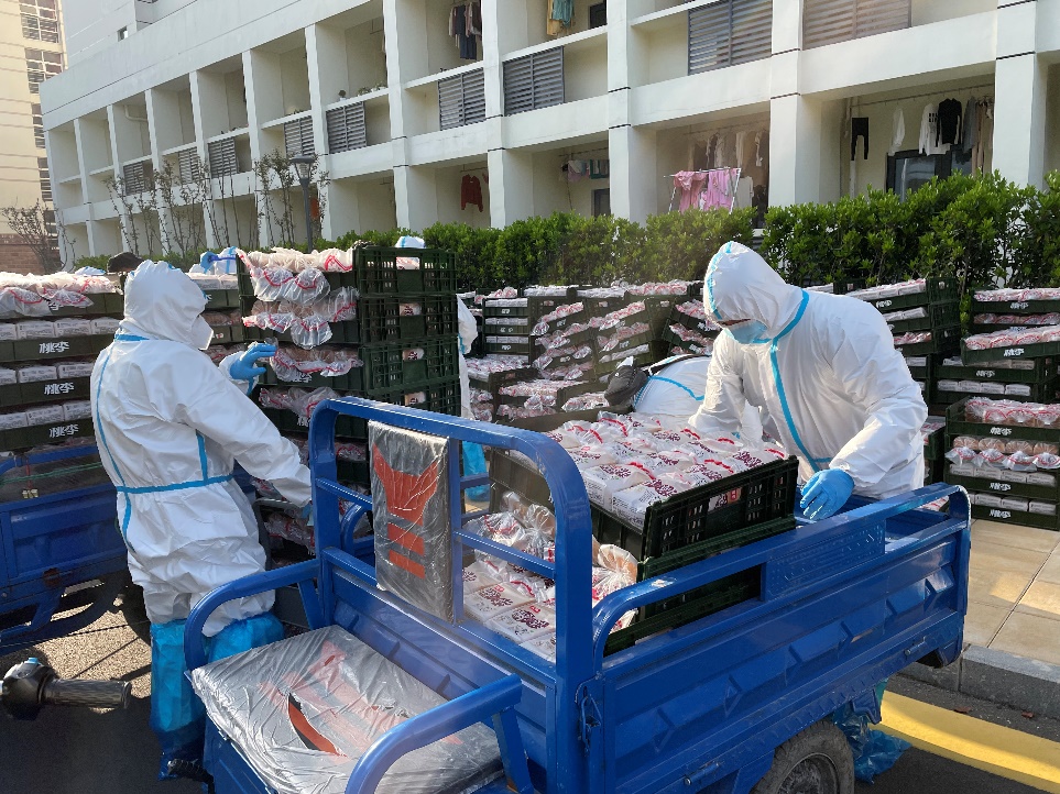 (志愿者老师正在搬卸食物)